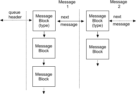 When a message is on a queue, the first block of the message contains links to preceding and succeeding messages on the same message queue, in addition to the link to the second block of the message (if present). The message queue head and tail are contained in the queue.