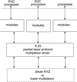 ``X.25 multiplexing stream'' shows a multiplexor configuration where the multiplexor (or multiplexing driver) routes messages between the lower Stream and one upper Stream. This Stream performs X.25 multiplexing to multiple independent Switched Virtual Circuit (SVC) and Permanent Virtual Circuit (PVC) user processes. Upper multiplexors are a specific application of standard STREAMS facilities that support multiple minor devices in a device driver. This figure also shows that more complex configurations can be built by having one or more multiplexed drivers below and multiple modules above an upper multiplexor.